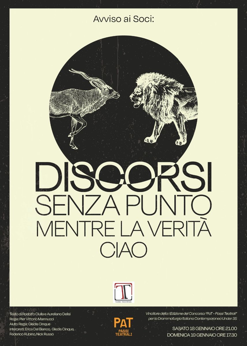 Dopo il successo di Quando arriva Briseide (Selezione In-Box 2024-25) e Il Compleanno di Niki (Roma Fringe Festival 2024) PaT – Passi Teatrali torna sulle scene romane con Discorsi Senza Punto Mentre la Verità Ciao, vincitore della I edizione del concorso “PaT - Passi Teatrali” per la drammaturgia italiana contemporanea. Il testo, scritto a quattro mani da Rodolfo Ciulla e Aureliano Delisi, ha vinto anche il premio di drammaturgia contemporanea "Shakespeare is now" (2019) ed è stato finalista a "Drammi di forza maggiore" (2021).