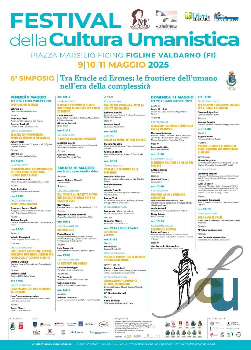 Dal 9 al 11 maggio 2025 si svolgerà la sesta edizione del Festival della Cultura Umanistica con il titolo “6° Simposio – Tra Eracle ed Ermes: le frontiere dell’umano nell’era della complessità”; un festival che di anno in anno accresce il suo successo e il suo pubblico, grazie all’Istituto Marsilio Ficino, proseguendo il suo percorso fatto di conversazioni, lectiones magistrales, dialoghi, letture e momenti musicali.