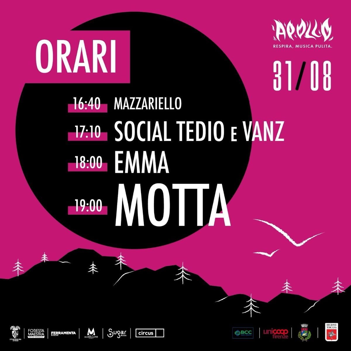 Imperdibile al giornata del 31 Agosto con Apollo festival con il concertone sul pratone di Vallombrosa con Motta, Social Tedio e Vanz, Emma, Mazzariello; contornato da Mercato con street food e prodotti tipici lungo la strada che costeggia il Pratone di Vallombrosa.