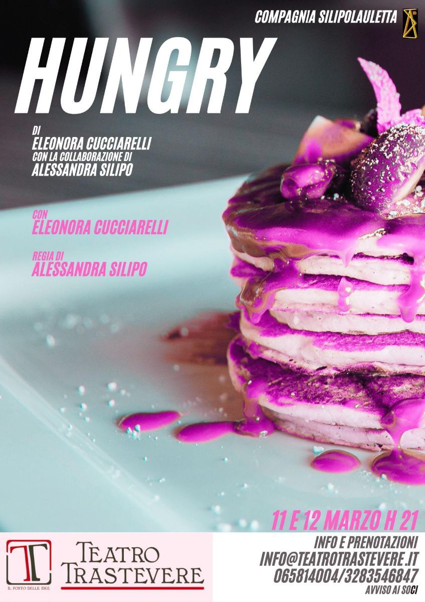 E poi lei: La Pizza! HUNGRY è una ‘dramedy’ dai sottotoni grotteschi, è una beffarda stand up che esplora con un linguaggio contemporaneo i temi del disordine alimentare, del culto del sé indotto dai social e da un’industria abituata a spremere fino a prosciugare le persone che ne fanno parte, tutto per la ricerca della cosí ambita perfezione. Uno spettacolo che esplora il percorso verso l’emancipazione da se stessi e del proprio riscatto sociale alla ricerca delle radici mistiche del digiuno intermittente. Gina è un’attrice arrivata finalmente al momento decisivo della sua carriera e il suo Ego la assiste ad ogni passo, con sfacciato sarcasmo e un po’ di sadismo.