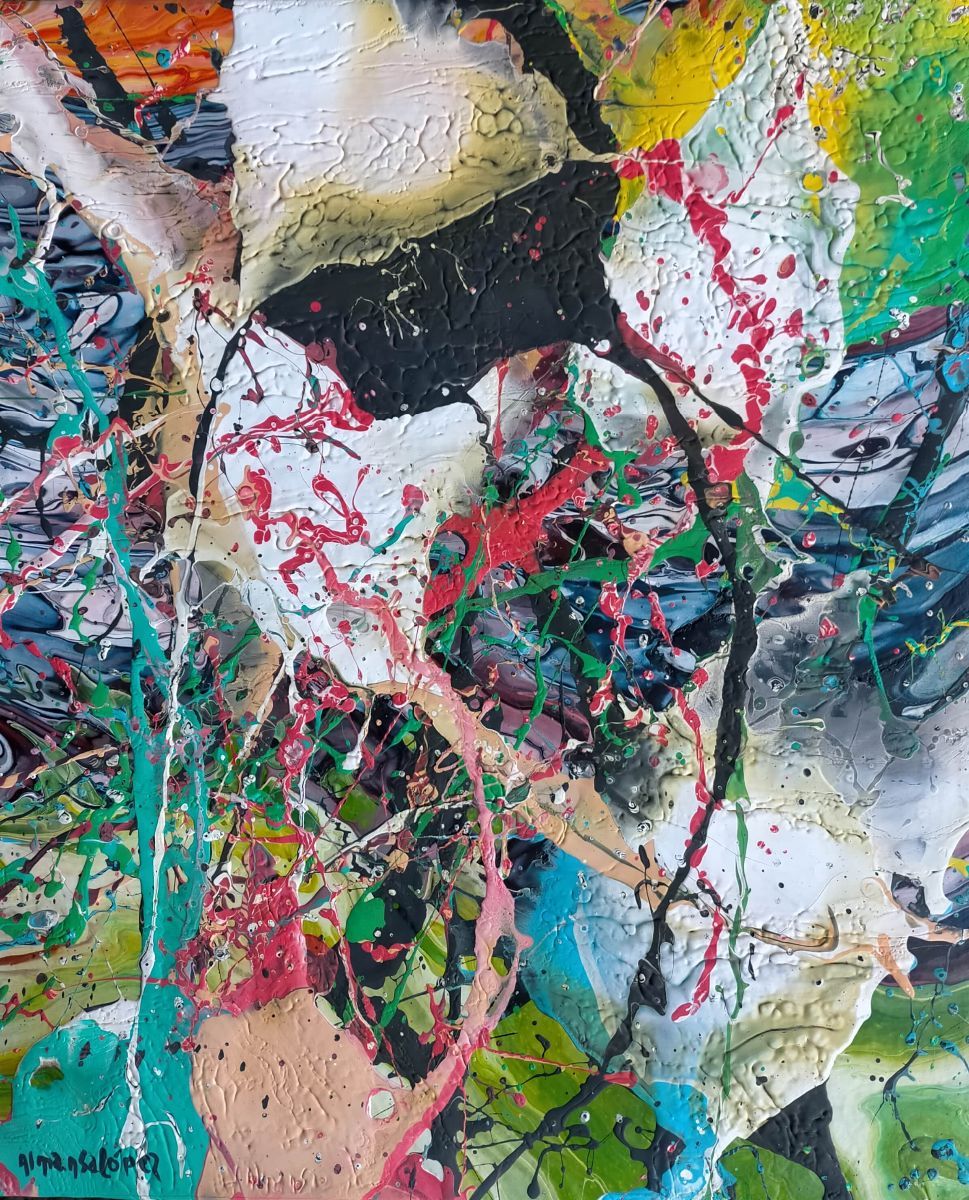 Per Javier Santana il colore si stacca dal pennello per trasformarsi in una carezza furiosa, paradosso del momento creativo e riflesso dello stato contemplativo dell’artista, e dialoga con il silenzio dello spazio.
