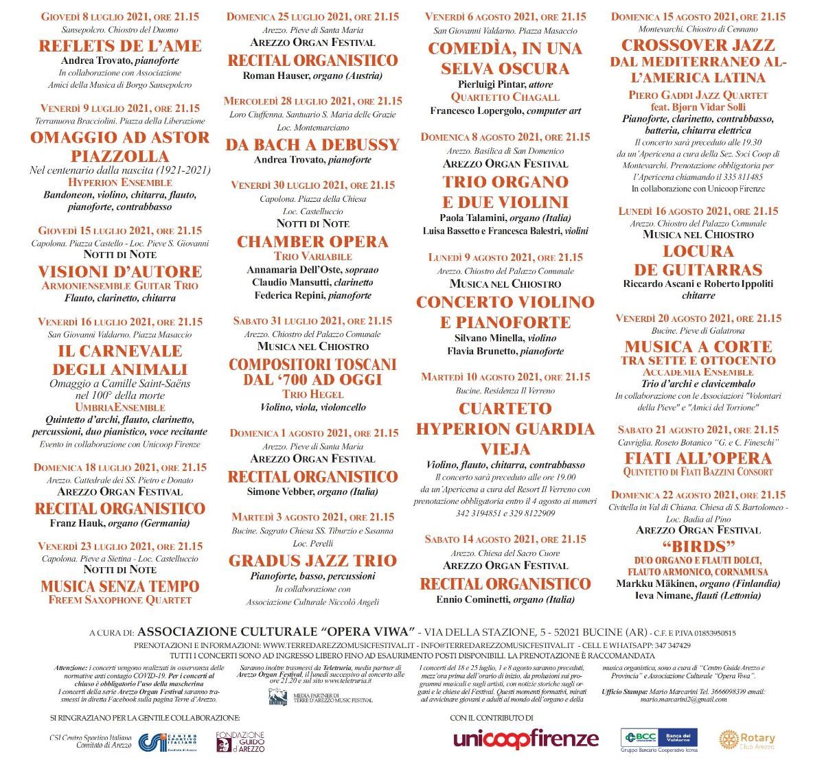 Per richiedere il cartellone completo, prenotazioni e informazioni: il sito sotto indicato, la pagina Facebook Terre d’Arezzo, info@terredarezzomusicfestival.it, Cell. e Whatsapp 347 3474929